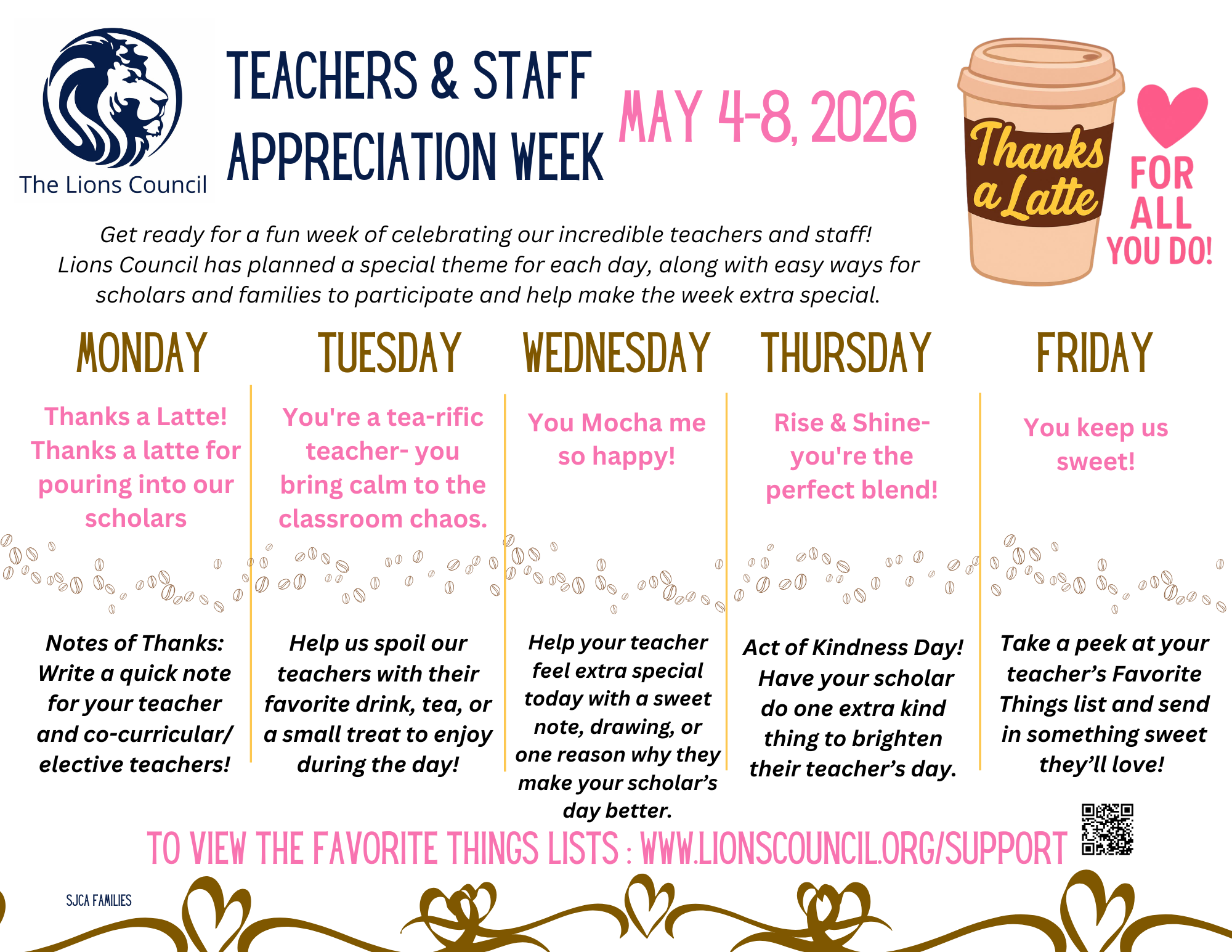 Lions Council has planned a special theme for each day, along with easy ways for scholars and families to participate and help make the week extra special.